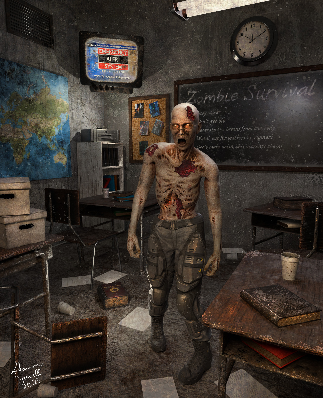 His pants and boots were all that remained of who he once was. They were designed to resist dirt, tears, and won't degrade over time. The t-shirt he was wearing at the time of being infected was a different story, it was ripped and torn away months ago. What survivors there were gathered and tried to find a way to survive the upcoming undead storm. He roamed one of these supposed survival rooms that now lay silent, while looking for something to satisfy his uncontrollable hunger.... My first image for my Halloween 2025 series. It's been a while since I posted but I hope you enjoy it and Happy Halloween! Thanks for taking a look and God Bless!