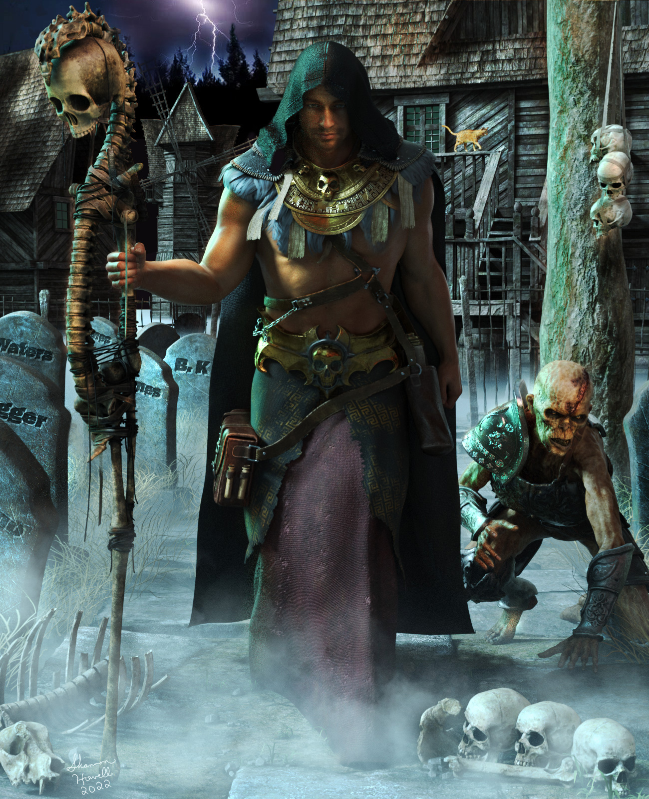 As Zaylekai entered the graveyard he saw skulls hanging from a tree and bones scattered the walkway of the cemetery. Not something you normally see in such a quiet town.